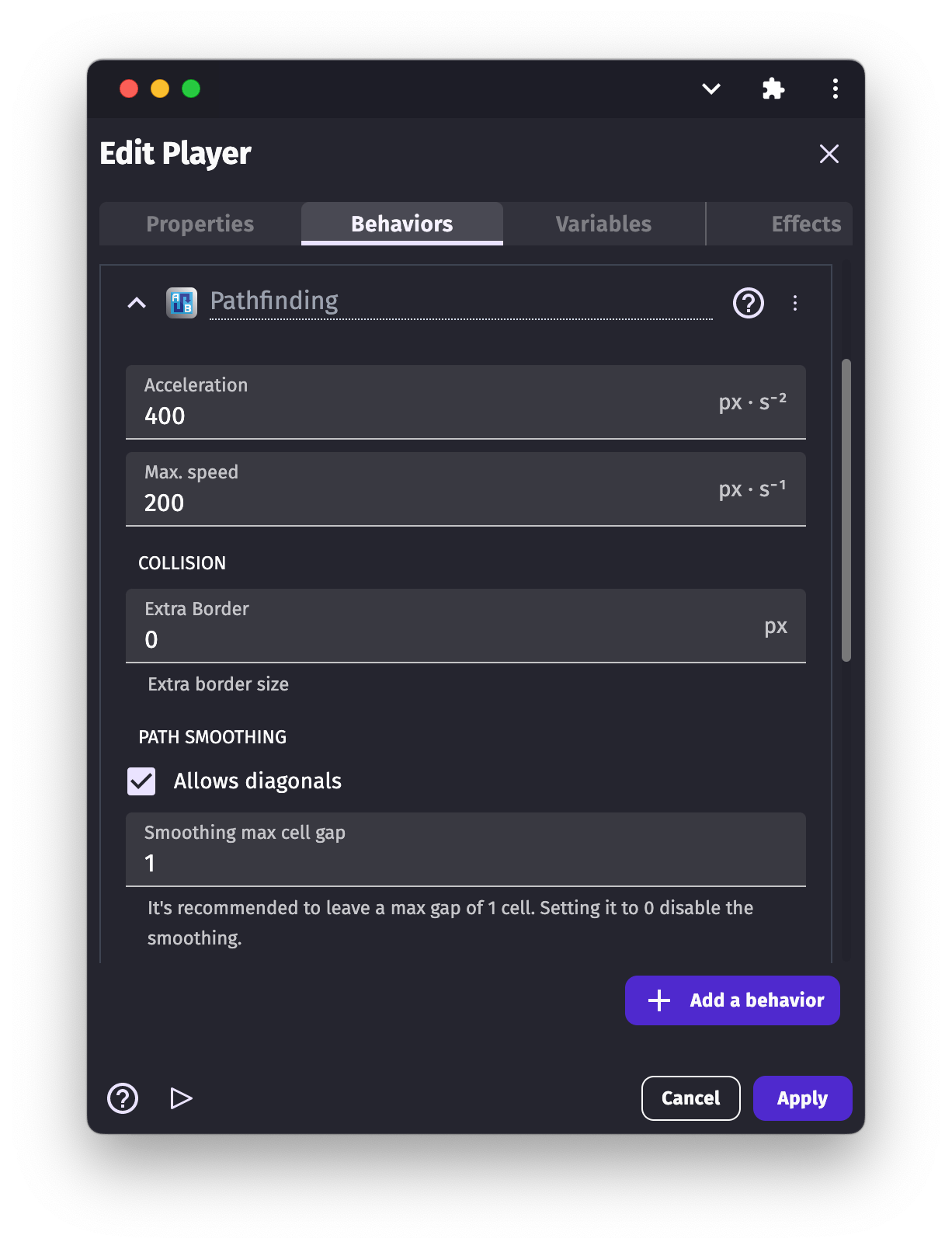 The Pathfinding behavior allows to move objects to a selected destination as well as to flag items as obstacles. Objects that are flagged as obstacles will be avoided by the moving objects.